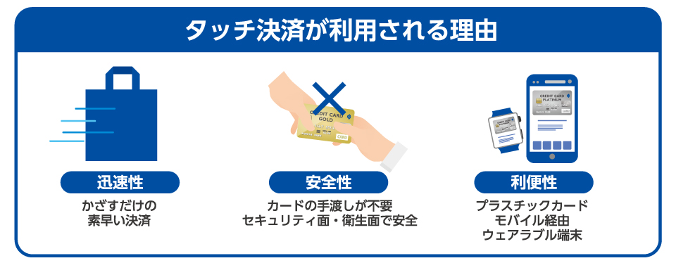 決済用端末にカードやスマートフォン等のデバイスを” タッチ” するだけで決済が完了するため、スピーディな決済が可能です。