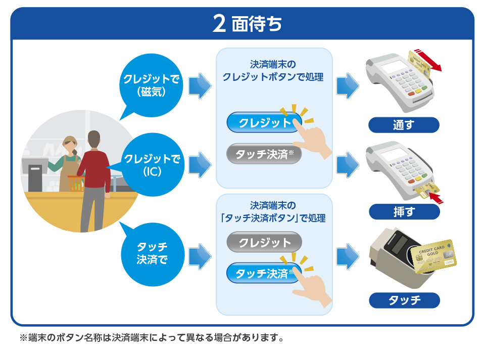 共同利用端末(CCT)でのタッチ決済の受入方法は「2面待ち」と「3面待ち」の2 種類があります。