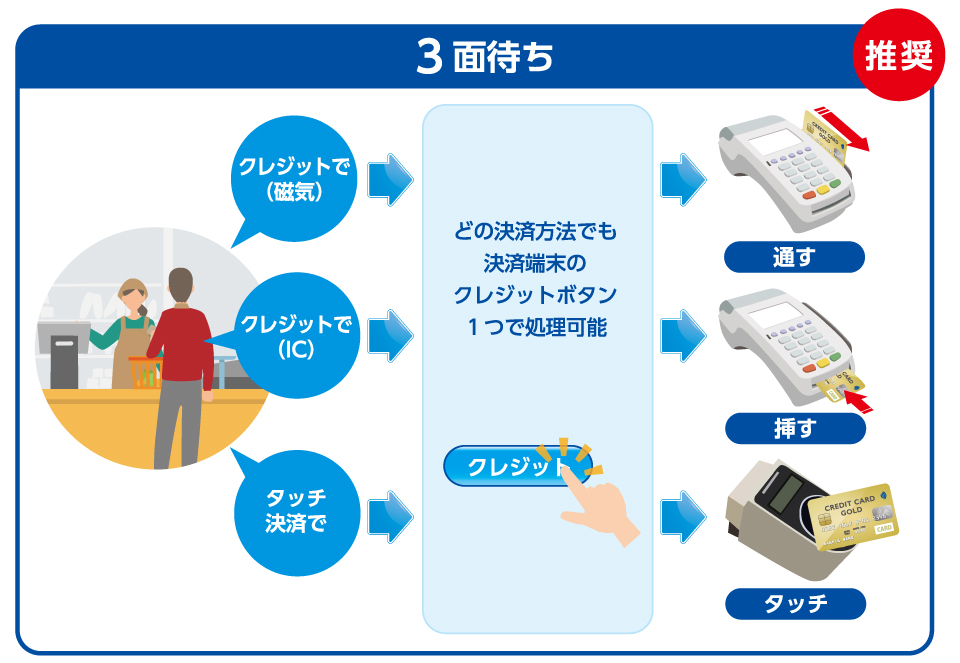 JCCA では受け入れるカードによって操作するボタンを変える必要のない「3面待ち」を推奨しています。