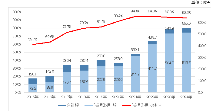 クレジットカード不正利用被害額は2024年で555億円と過去最高額を記録し、そのうち約92.5%を番号盗用による不正利用が占めています(※1)。背景には、実在のサービスや企業を騙って偽のメールやSMS(携帯電話のショートメッセージ)で偽サイトに誘導し、クレジットカード番号やパスワードなどの情報を盗み取る「フィッシング」の増加があります。