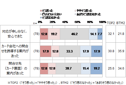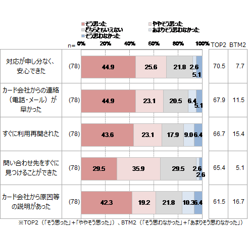 カード会社の対応は「申し分なく安心できた(71%)」「連絡が早かった(68%)」「すぐ再開された(67%)」と概ね高評価。