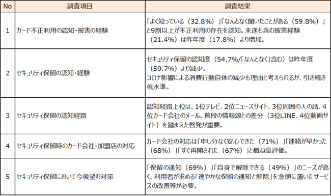 本調査結果を踏まえ、JCCAではクレジットカード会社によるセキュリティ対策についてクレジットカード利用者に広くご理解をいただけるよう周知活動を継続していくとともに、安全・安心にご利用いただける環境整備を引き続き行ってまいります。